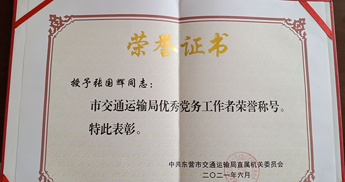 張國輝榮獲“市交通運(yùn)輸局優(yōu)秀黨務(wù)工作者”
